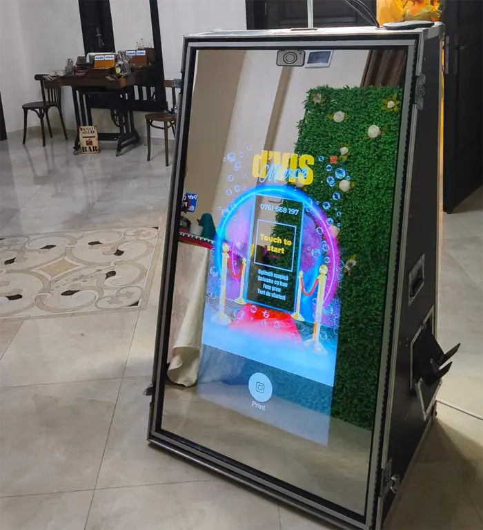 Oglinda foto este un element interactiv apreciat de invitați, ideal pentru fotografii creative și momente amuzante. Aceasta oferă o experiență modernă și elegantă, perfectă pentru nunți, petreceri și evenimente speciale.